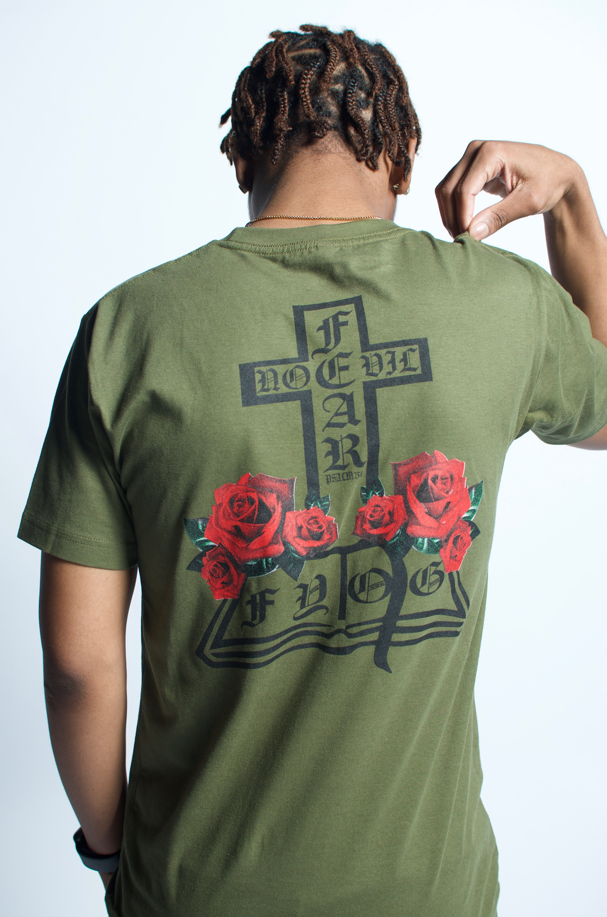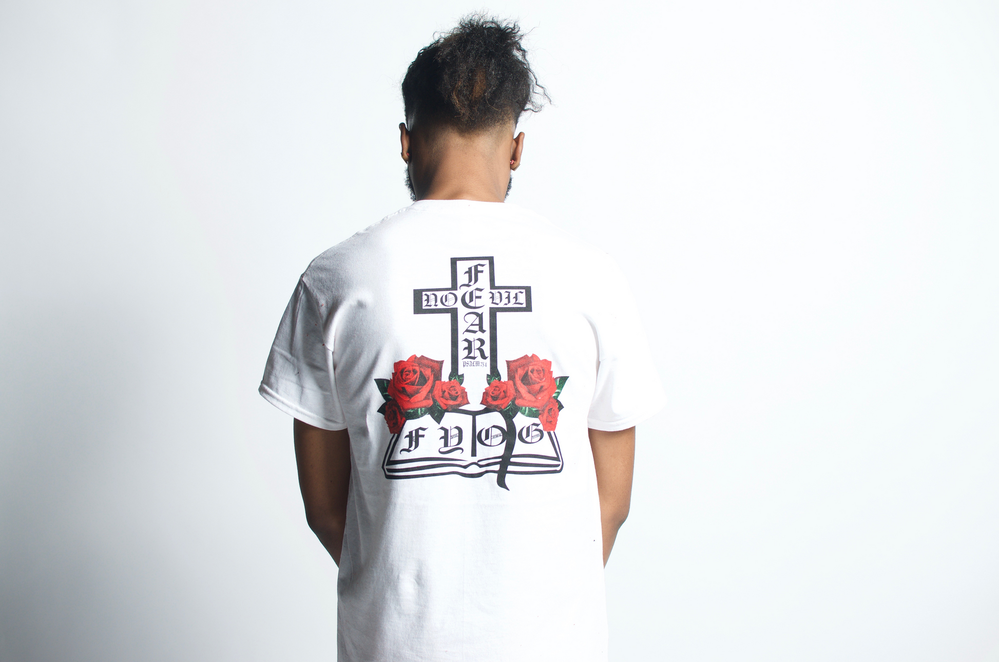 - Printed FYOG FNE cross & bookΒ with flowers design on back of tee