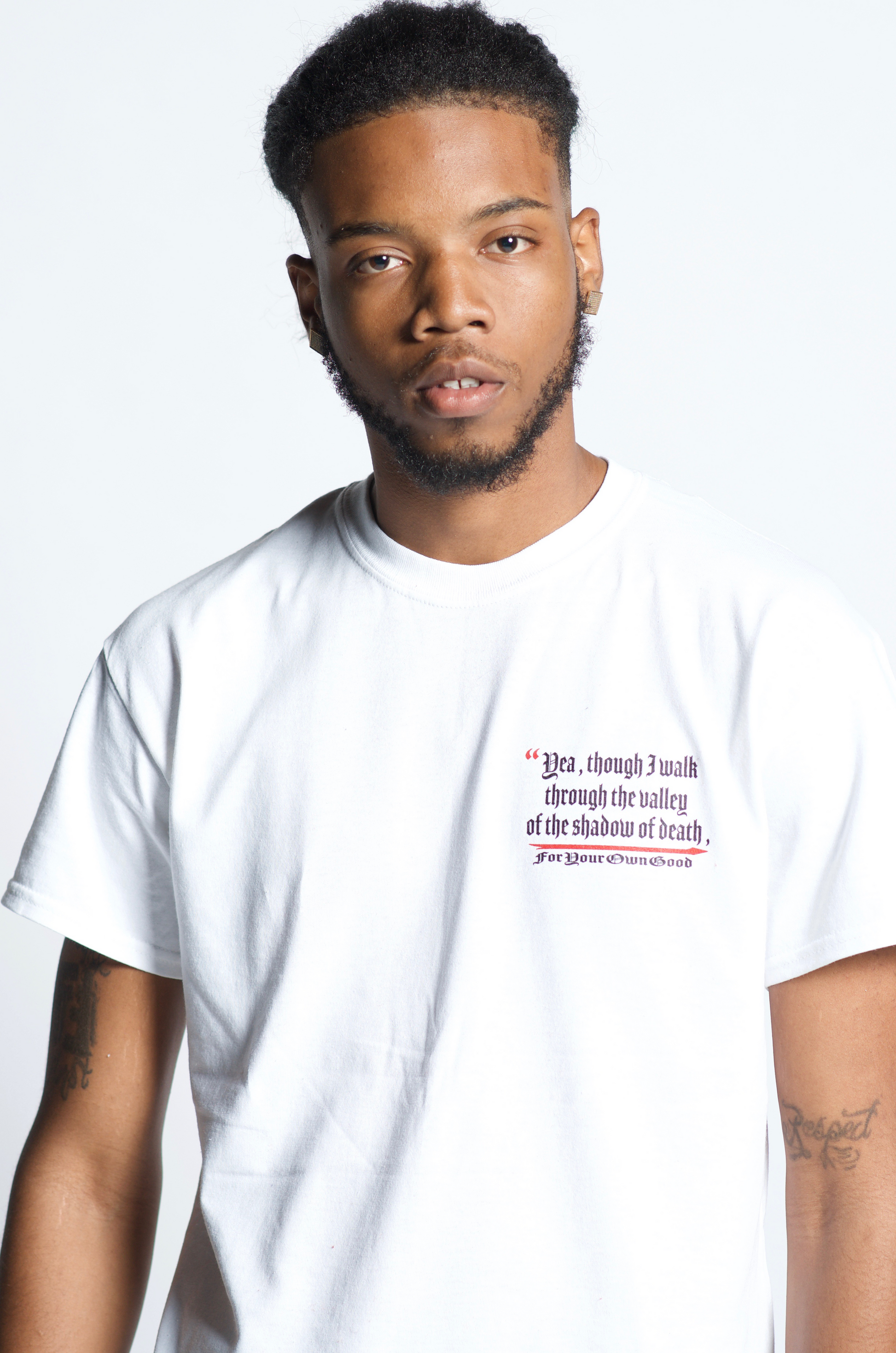 - CompletedΒ verse Psalms 23;4 printed on lower back of tee with FORYOUROWNGOOD across backΒ
